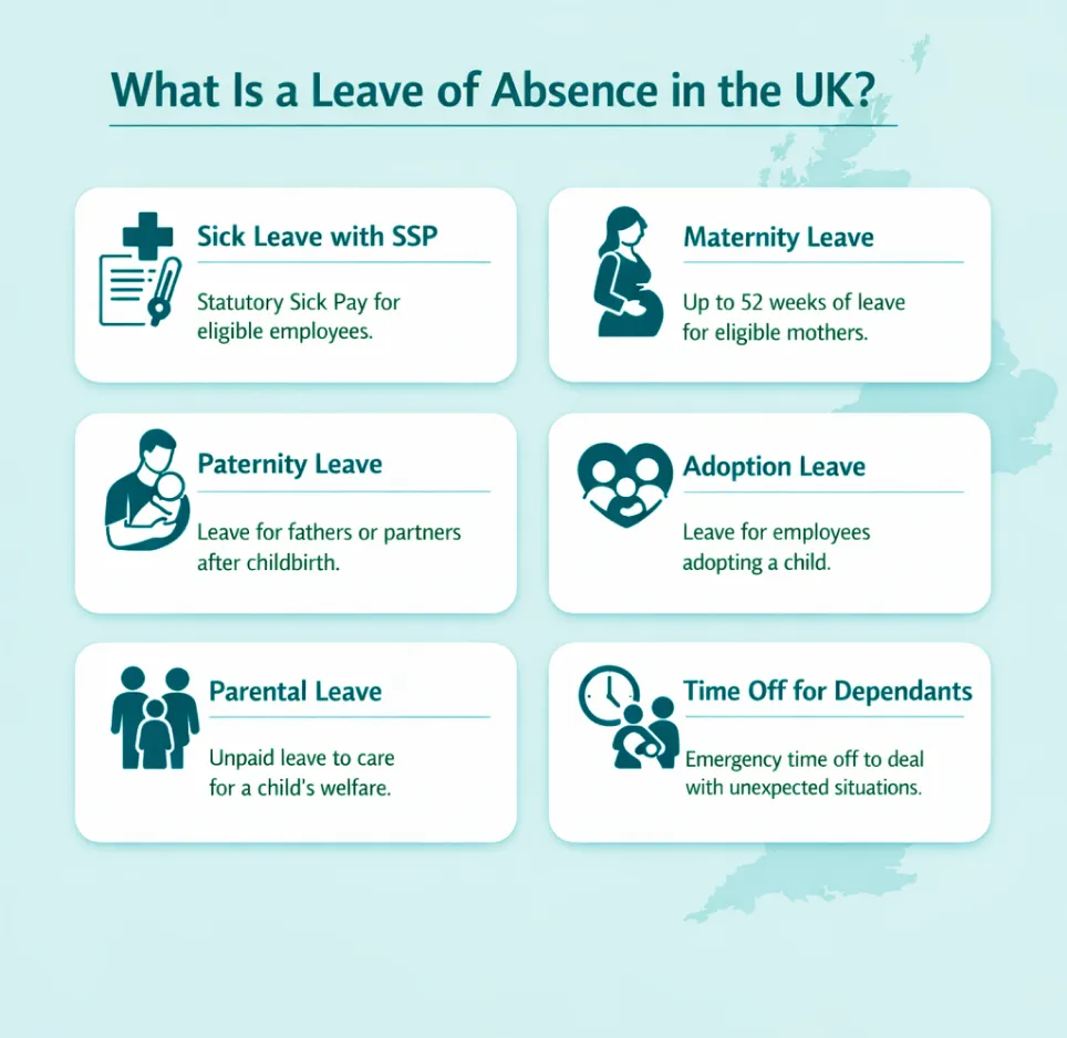 You have statutory rights to take time off for approved reasons under UK law. In the leave of absence UK system, some types of leave are protected by employment law. Statutory leaves in the UK are: