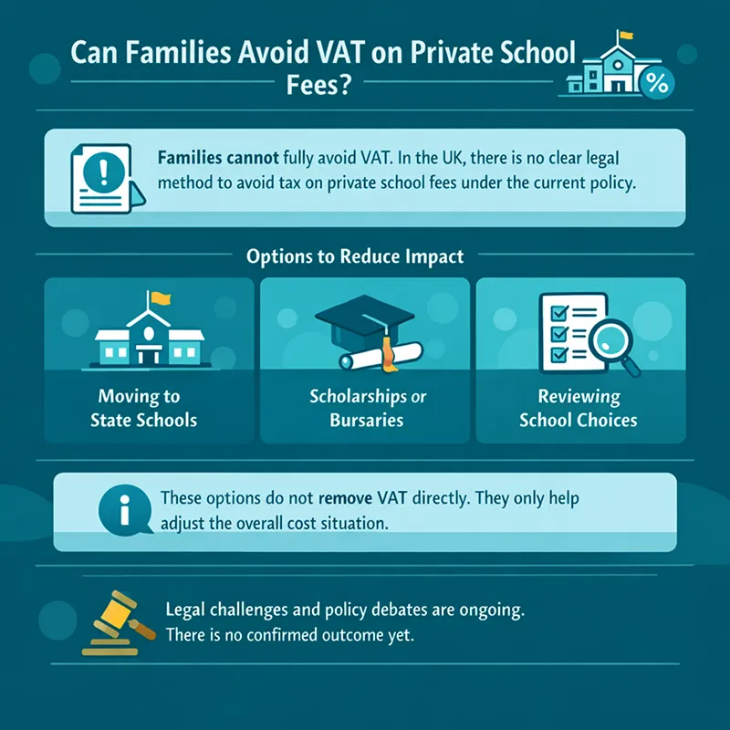 No, families can not fully avoid VAT. In the UK, there is no clear legal method to avoid tax on private school fees under the current policy.